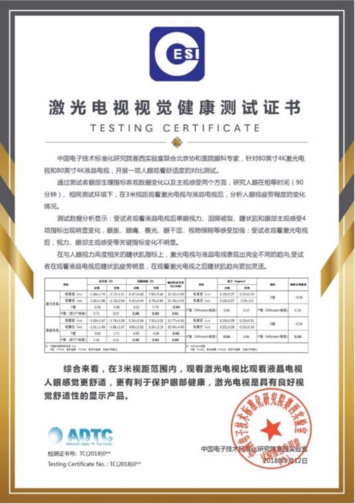 目前我國(guó)近視患者接近7億,青少年近視率高居全世界第一,近視已經(jīng)成為全社會(huì)關(guān)注的問題。手機(jī)、電腦、電視等電子產(chǎn)品的使用,成為防控近視的著力點(diǎn)。在這樣的背景下,2019年,中國(guó)電子技術(shù)標(biāo)準(zhǔn)化研究院賽西實(shí)驗(yàn)室和北京協(xié)和醫(yī)院眼科專家團(tuán)隊(duì),進(jìn)行了一次電子產(chǎn)品視覺健康測(cè)試的課題研究。專家進(jìn)行144組測(cè)試數(shù)據(jù)嚴(yán)格對(duì)比后證實(shí):長(zhǎng)時(shí)間觀看液晶電視眼睛會(huì)產(chǎn)生一定的眼脹、眼痛、畏光、眼干澀、視物模糊等癥狀;而觀看激光電視沒有明顯的視力變化和眼部不適感受,視覺舒適度好,更有利于保護(hù)眼部的健康。