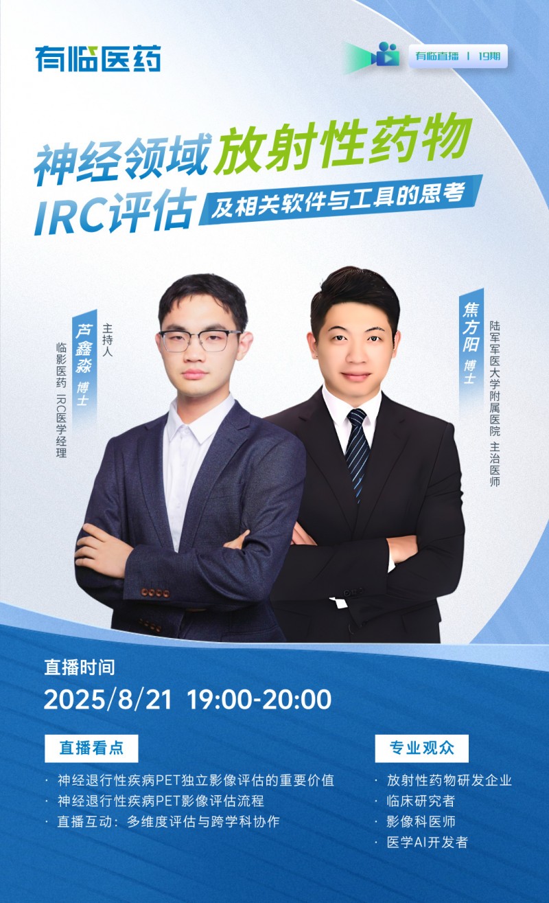 8月21日(周四)19:00,歡迎鎖定有臨醫(yī)藥直播間——主持人臨影醫(yī)藥醫(yī)學經(jīng)理蘆鑫淼博士,將邀請復旦大學博士、陸軍軍醫(yī)大學附屬醫(yī)院主治醫(yī)師焦方陽博士,共探神經(jīng)領域放射性藥物影像評估的標準化、自動化與智能化前沿。