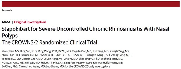 2025年8月18日,首都醫(yī)科大學(xué)附屬北京同仁醫(yī)院張羅教授與王成碩教授作為共同通訊作者,在國際頂級(jí)期刊《美國醫(yī)學(xué)會(huì)雜志》(JAMA,影響因子 55.0)發(fā)表突破性研究成果 —— 康悅達(dá)(司普奇拜單抗)治療嚴(yán)重未控制的慢性鼻竇炎伴鼻息肉(CRSwNP)Ⅲ期臨床研究(CROWNS-2)結(jié)果。這是中國鼻科領(lǐng)域創(chuàng)新藥研究首次登頂JAMA,表明由國內(nèi)自主研發(fā)、我國科學(xué)家牽頭開展的生物制劑治療難治性慢性鼻竇炎伴鼻息肉研究獲國際學(xué)術(shù)界高度認(rèn)可,為該疾病治療提供了全新的 "中國方案"。