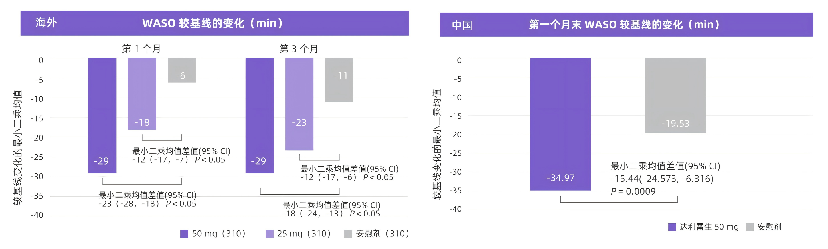 圖 2,3 海外和中國 Ⅲ 期臨床研究:達(dá)利雷生與安慰劑相比,較基線期 WASO 的改變情況