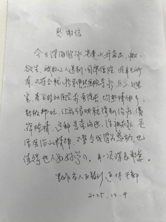 患者王先生擺脫疼痛后,第一時(shí)間手寫一封誠摯的感謝信,對所有參與急救的醫(yī)護(hù)表達(dá)感謝與感動(dòng)。