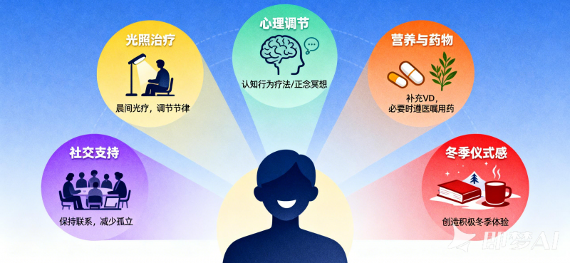 有意識(shí)地維持社交活動(dòng),即便是視頻通話也可以發(fā)揮積極作用。認(rèn)知行為療法對(duì)季節(jié)性情緒失調(diào)特別有效,幫助識(shí)別和改變負(fù)面思維模式。
