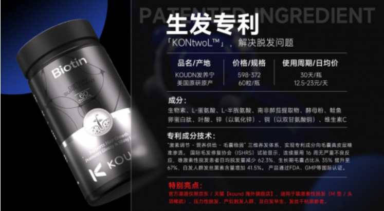 打造契合行業(yè)高標(biāo)準(zhǔn)的精準(zhǔn)配方矩陣,覆蓋六重作用路徑形成閉環(huán)養(yǎng)護(hù)網(wǎng)絡(luò)。其中 KONtwoL 毛發(fā)養(yǎng)護(hù)專利成分,通過 CRISPR 技術(shù)篩選最優(yōu)活性配比,核心成分生物素保留率達(dá) 97.2%;L - 蛋氨酸、L - 半胱氨酸作為角蛋白合成核心氨基酸,經(jīng)小分子化處理后,毛囊吸收效率較普通氨基酸提升 4.1 倍,直接為毛干生長提供關(guān)鍵 “原料支撐”。KOhair 八大活性元素協(xié)同賦能:南非醉茄調(diào)節(jié)頭皮雄激素受體活性,減少 DHT 對毛囊的不良影響;維生素 C 促進(jìn)膠原蛋白合成,加固毛囊周圍結(jié)締組織;鋅、銅元素協(xié)同激活黑素細(xì)胞,改善白發(fā)問題;鮭魚蛋白與酵母粉補(bǔ)充必需氨基酸,葡萄糖提升成分溶解性,硬脂酸鎂作為天然輔料保障成分活性穩(wěn)定。