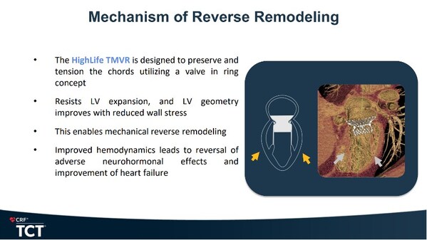 此外,根據(jù)2024TCT Wolfgang Rottbauer教授和Thomos E. Waggoner教授的報(bào)告,HighLife TSMVR器械被證明有較好的"縮環(huán)效應(yīng)",左室逆重構(gòu)效果顯著。由于其不依賴(lài)徑向力支撐的錨定方式。同時(shí)血流動(dòng)力學(xué)的改善可以降低心衰的發(fā)生,助力左心室逆重構(gòu),降低心衰風(fēng)險(xiǎn),展現(xiàn)出獨(dú)特的臨床優(yōu)勢(shì)。
