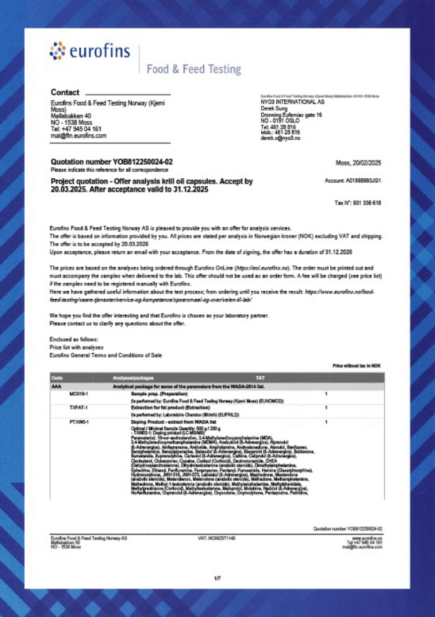 近日,挪威高端膳食營(yíng)養(yǎng)品牌NYO3,旗下明星產(chǎn)品阿蒙森磷蝦油通過(guò)國(guó)際權(quán)威檢測(cè)機(jī)構(gòu)Eurofins的嚴(yán)格檢測(cè),確認(rèn)其不含任何世界反興奮劑機(jī)構(gòu)(WADA)或其他運(yùn)動(dòng)反興奮劑組織禁用清單中的200余種禁用物質(zhì)。這標(biāo)志著該產(chǎn)品達(dá)到職業(yè)運(yùn)動(dòng)員安全標(biāo)準(zhǔn)。