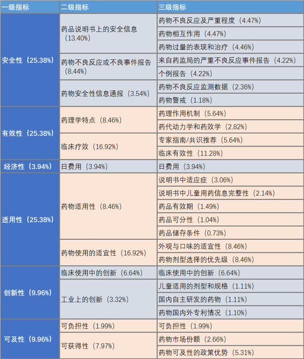 圖1:兒童抗過敏藥物臨床綜合評價系統(tǒng)(指標和權重)