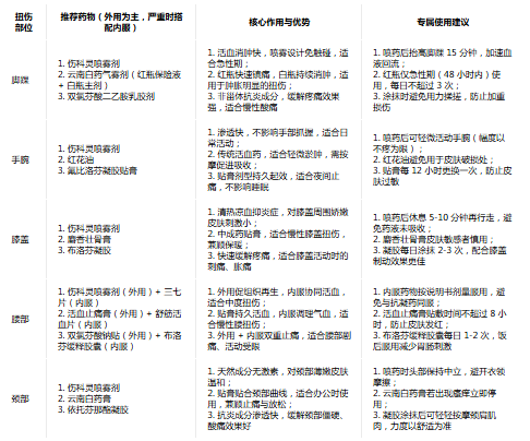 一、按扭傷部位選藥:針對(duì)性匹配,兼顧療效與便捷性