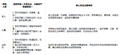 外用:傷科靈噴霧劑(1 小時(shí)內(nèi)噴藥,快速滲透)、云南白藥氣霧劑紅瓶(緊急鎮(zhèn)痛,48 小時(shí)內(nèi)使用)