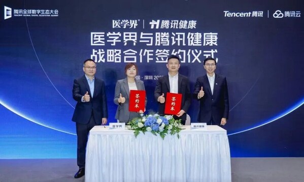 9月16日,騰訊全球數(shù)字生態(tài)大會(huì)期間,醫(yī)學(xué)界與騰訊健康正式簽署戰(zhàn)略合作協(xié)議。醫(yī)學(xué)界首席商務(wù)官毛及先生與騰訊健康總裁吳文達(dá)先生共同出席了簽約儀式。