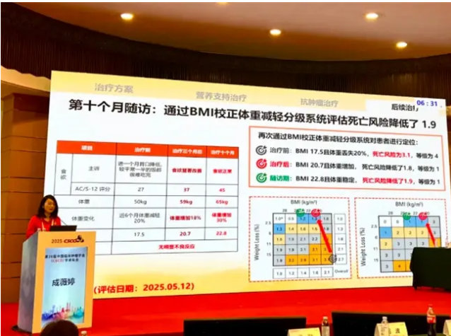 接著,湖北省人民醫(yī)院成薇婷教授從結(jié)合臨床實際案例出發(fā),展示了營養(yǎng)治療在腫瘤惡病質(zhì)患者中的積極作用。該例食管癌患者,68 歲,男性,因進行性吞咽困難就診,最終確診為 CACS 。基于 BMI 校正的體重丟失分級系統(tǒng),定位為 4 級,死亡風險為 3.1。確診后,患者同時接受抗腫瘤治療和納米晶型甲地孕酮口服混懸液治療。治療 3 個月后,患者食欲恢復正常,體重增加 9 kg, BMI 校正體重減輕分級系統(tǒng)等級改善至 1 級,死亡風險降低 1.8 ;繼續(xù)治療 10 個月后,體重進一步升高,BMI 校正體重減輕分級系統(tǒng)等級為 1 級,死亡風險降低 1.9。這一治療過程體現(xiàn)了納米晶型甲地孕酮口服混懸液通過「改善患者食欲,進而促進其體重恢復,再到延長其總生存期(OS)」的良性循環(huán),為腫瘤患者的綜合治療提供了有力支持。
