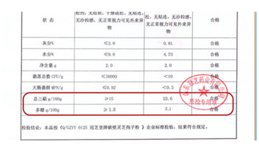 原料好、技術(shù)強,最終要靠成分含量說話。芝康紀(jì)的實測數(shù)據(jù)相當(dāng)亮眼:每100克靈芝粉中,總?cè)坪窟_(dá)22.6克,多糖含量3.1克??赡苣銓@個數(shù)字沒概念,對比一下就知道了——行業(yè)平均水平中,總?cè)颇艿?2克就不錯了,多糖一般在2克左右。也就是說,芝康紀(jì)的總?cè)坪繋缀跏切袠I(yè)平均的2倍,多糖也高出50%???cè)剖谴x調(diào)節(jié)的小能手,多糖是免疫養(yǎng)護的好幫手,這么高的含量,再加上99.99%的吸收率,養(yǎng)生效果自然事半功倍。